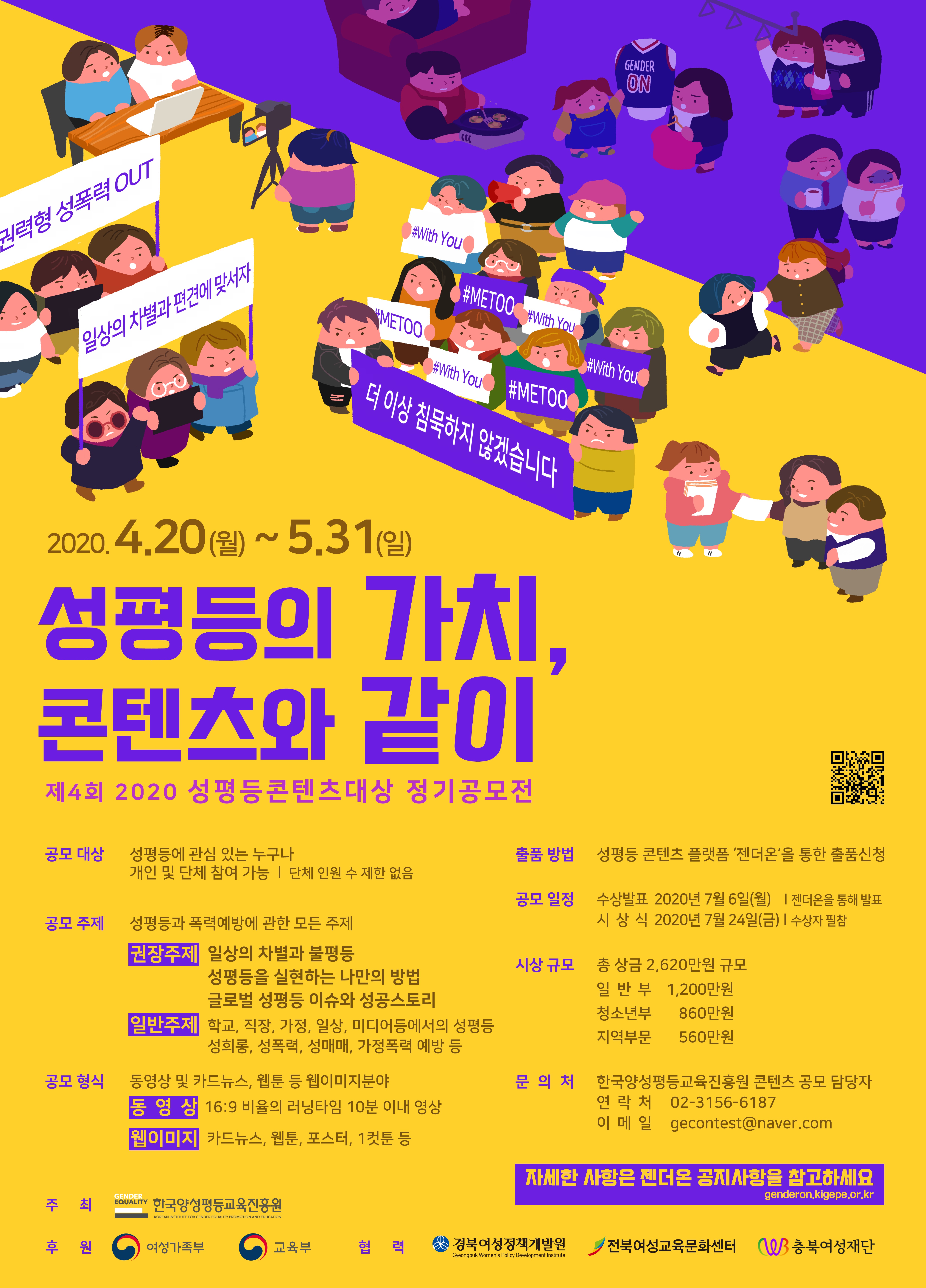 HOME > 커뮤니티 > 공지사항 커뮤니티공지사항 자료실 공지사항 제4회 2020 성평등콘텐츠대상 정기공모전 안내 작성자 인권센터 작성일 2020-04-22 10:45 조회 504 첨부파일 : (출품요강) 제4회 2020 성평등콘텐츠대상 정기 공모전.pdf 목록보기 이전 다음